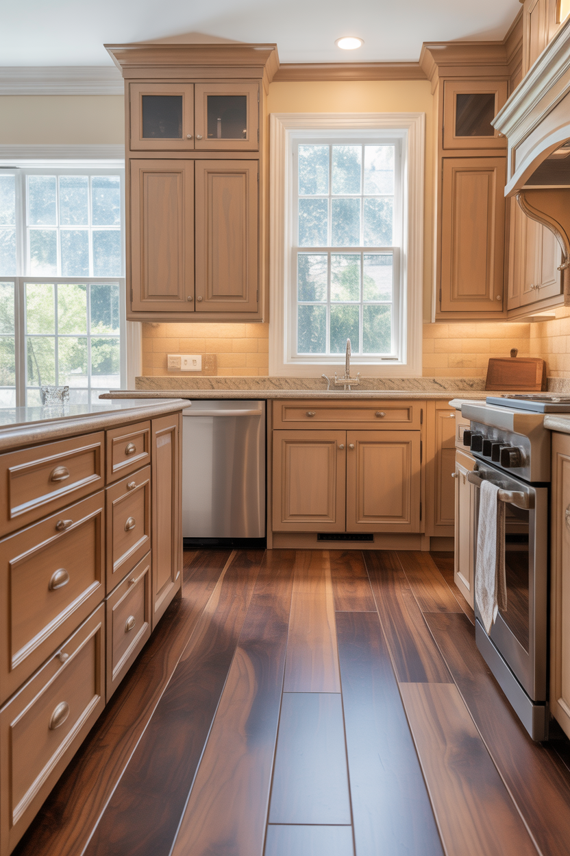 For a warmer look, terracotta tiles or natural stone in earthy tones complement the warmth of beige cabinets. Avoid flooring that’s too similar in tone to your cabinets, as this can create a washed-out appearance lacking definition and depth.