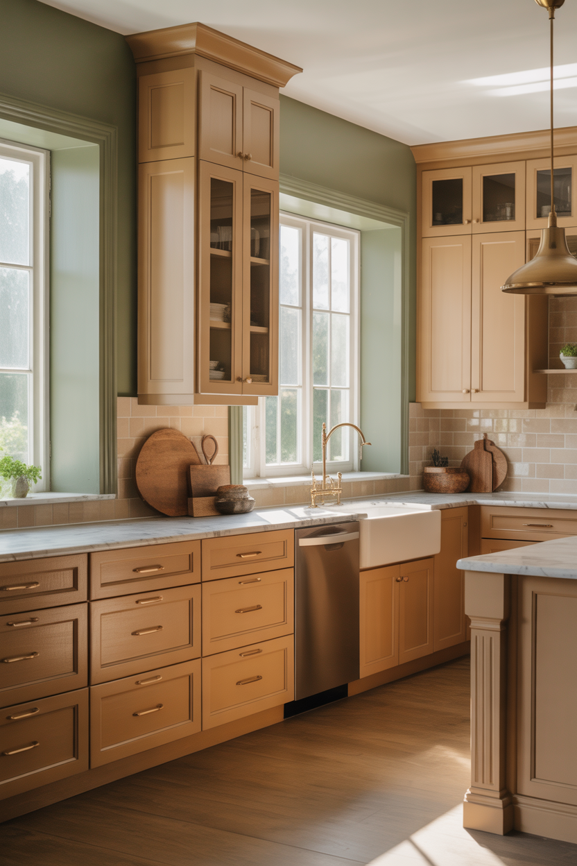 Seasonal décor changes become easy with beige cabinets – switch from cool blues in summer to warm oranges and reds in fall. This flexibility allows you to refresh your kitchen’s look regularly without major renovations or expenses.