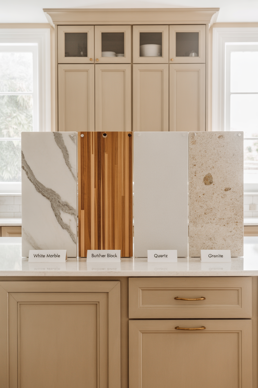 Beige kitchen cabinets pair exceptionally well with a wide range of countertop materials. White marble with gray veining creates an elegant, high-end look, while butcher block adds warmth and rustic charm. Quartz countertops in white, gray, or even black provide a modern contrast that makes beige cabinets pop.