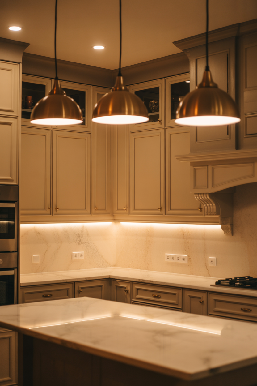 Under-cabinet lighting illuminates workspaces while highlighting the quality of your cabinetry. Statement pendant lights in metallic finishes add personality and draw the eye upward, creating visual balance in your kitchen design.
