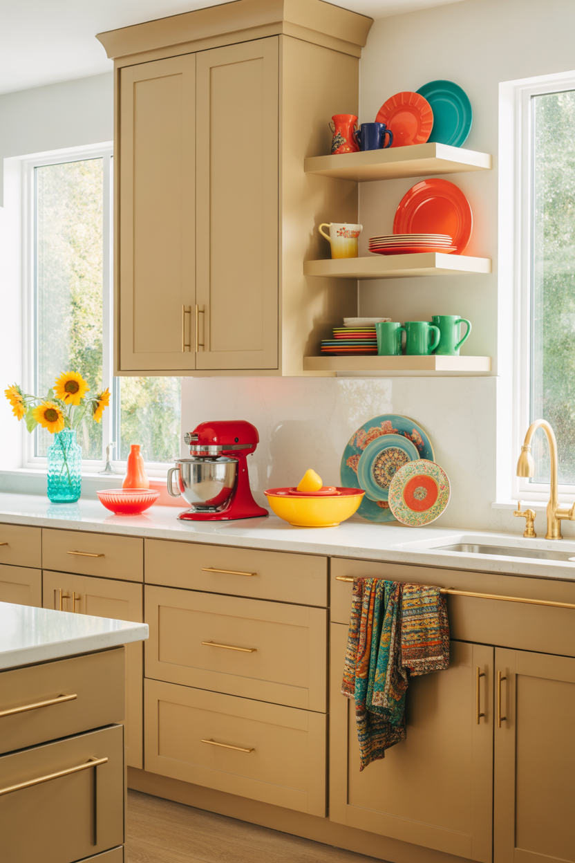 While beige provides a neutral foundation, don’t be afraid to introduce color through accessories and décor. Beige kitchen cabinets serve as the perfect backdrop for colorful dishware, vibrant artwork, or patterned textiles. Fresh flowers, colorful small appliances, or decorative bowls add personality without permanent commitment.