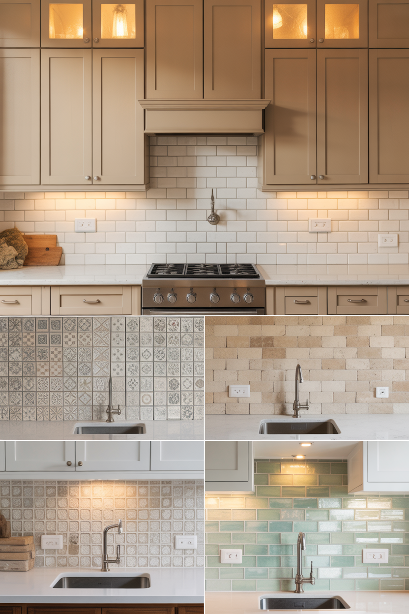 Glass tiles in soft blues or greens introduce color without overwhelming the neutral palette. For a budget-friendly option, consider beige kitchen cabinets paired with painted beadboard or simple ceramic tiles in complementary neutral tones.