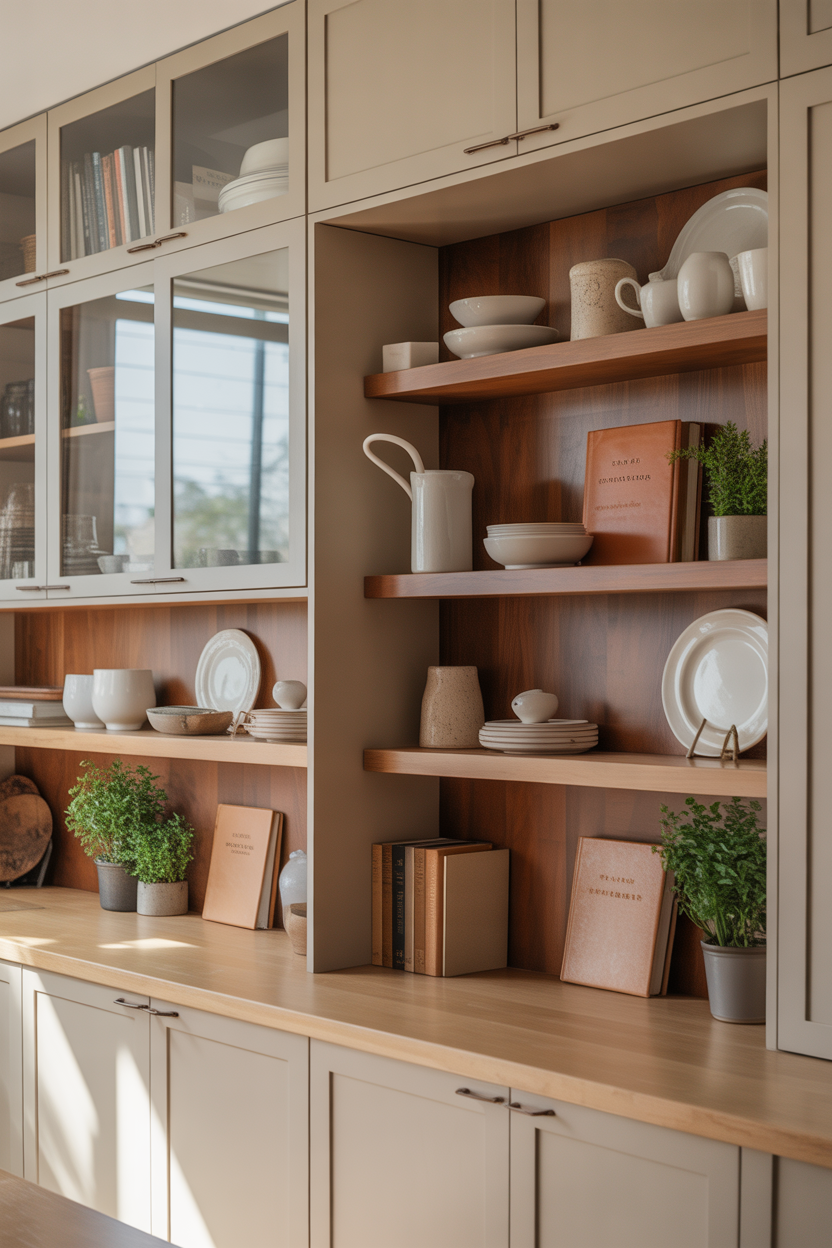 Breaking up expanses of beige cabinetry with open shelving creates visual interest and practical storage. Display beautiful dishware, cookbooks, or decorative items on floating shelves in materials like natural wood or metal. This approach adds dimension to your kitchen while keeping frequently used items easily accessible.
