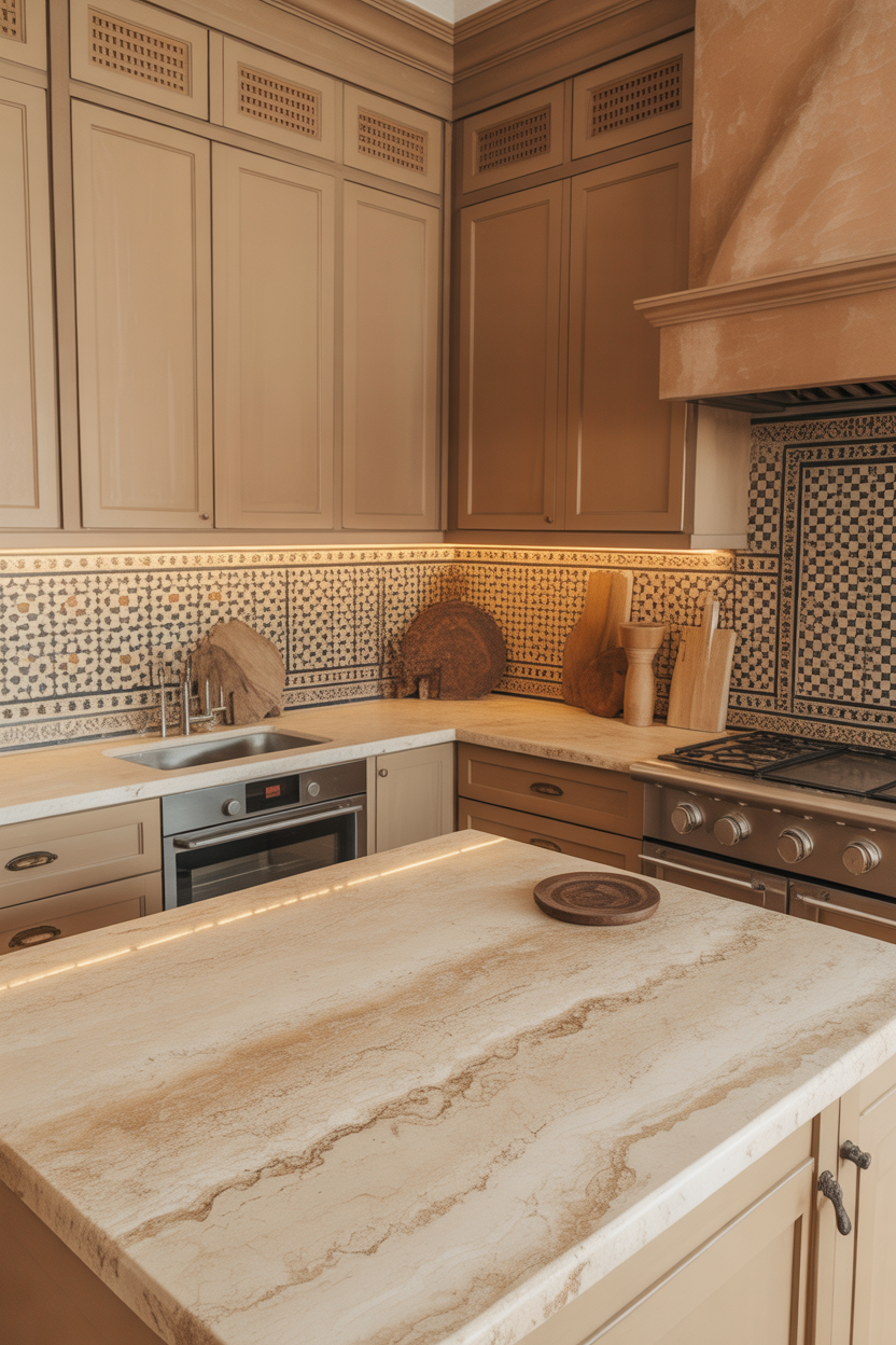 Pair your beige cabinets with countertops that enhance the Moroccan theme while providing practical durability. Natural stone options like travertine, limestone, or cream-colored marble beautifully complement the Beige Kitchen Cabinet Color while adding organic texture typical of Moroccan design.