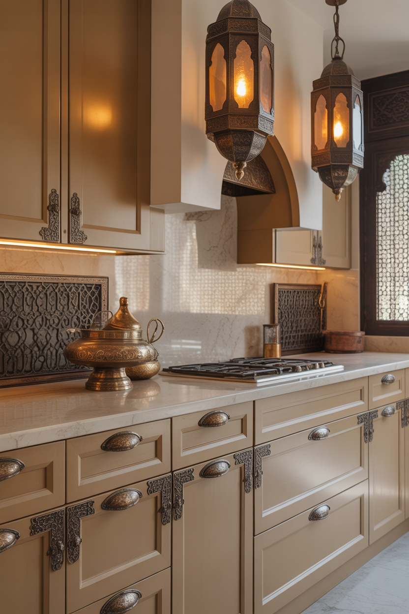 Consider hammered metal drawer pulls, lantern-style pendant lights, or decorative metal screens to enhance the Moroccan aesthetic. The reflective quality of these metallic accents bounces light around the space, preventing beige from feeling too muted. This interplay between matte cabinet surfaces and gleaming metal fixtures adds luxury and sophistication to your kitchen design.