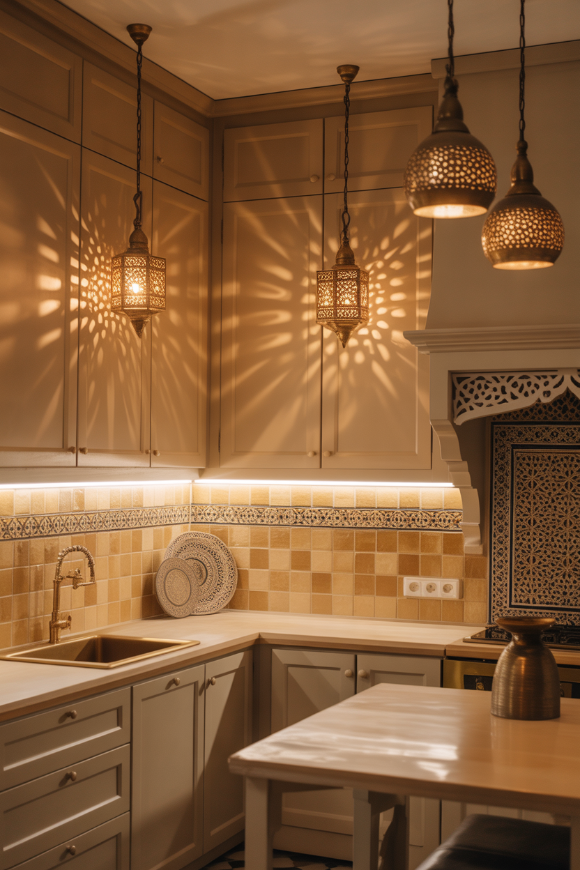 Install under-cabinet lighting to prevent beige from appearing too dark in shadowed areas. This functional addition also showcases your tile backsplash beautifully. Consider dimmable options to adjust the mood—brighter for cooking tasks, softer for entertaining. Warm-toned LED bulbs (2700K-3000K) enhance beige’s inherent warmth while maintaining the cozy Moroccan ambiance.