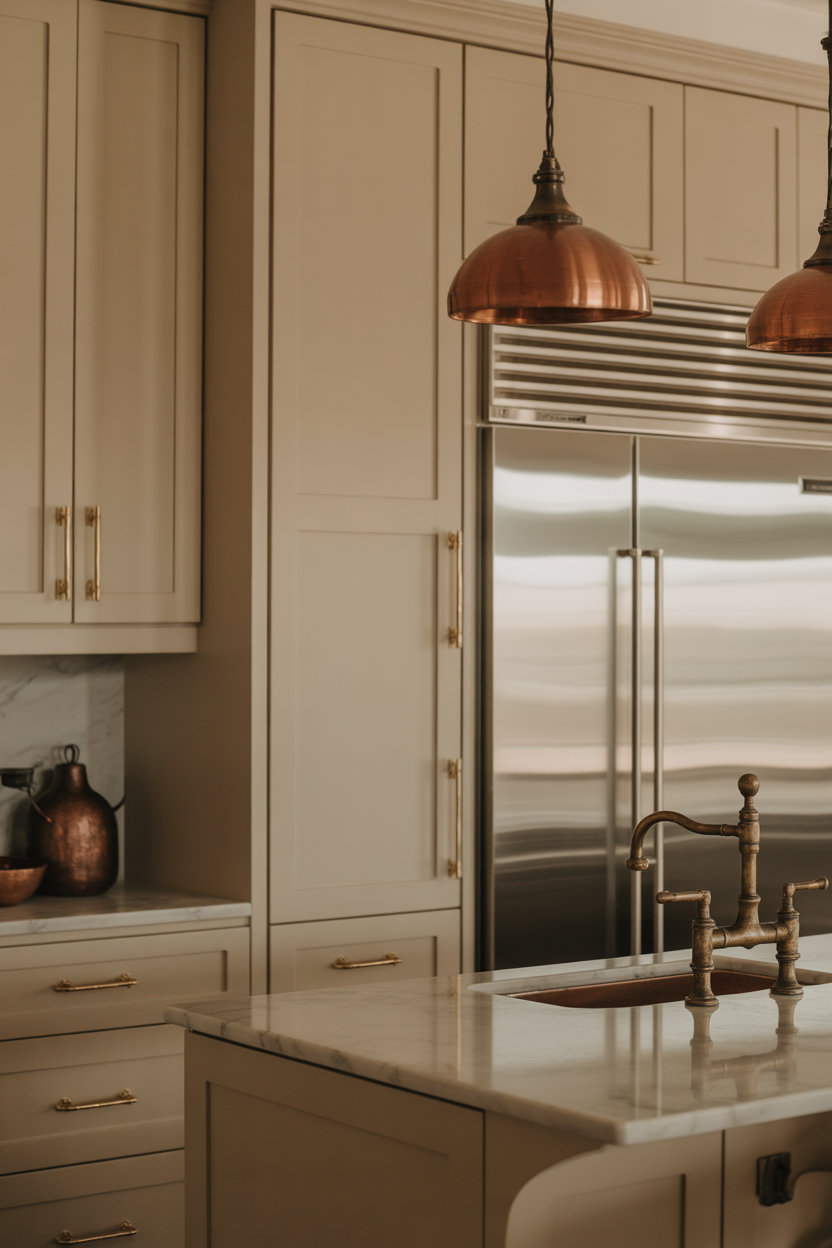 Metal accents add sophistication and visual interest to kitchens featuring beige cabinets. Mixing metals creates designer appeal when done thoughtfully and intentionally. Warm metals like brass, copper, and gold naturally complement beige’s undertones. Chrome and stainless steel provide modern contrast while maintaining clean lines. Aged or antiqued finishes add character to traditional or farmhouse-style kitchens. Limit yourself to two or three metal finishes to avoid visual chaos and maintain cohesion throughout the space.