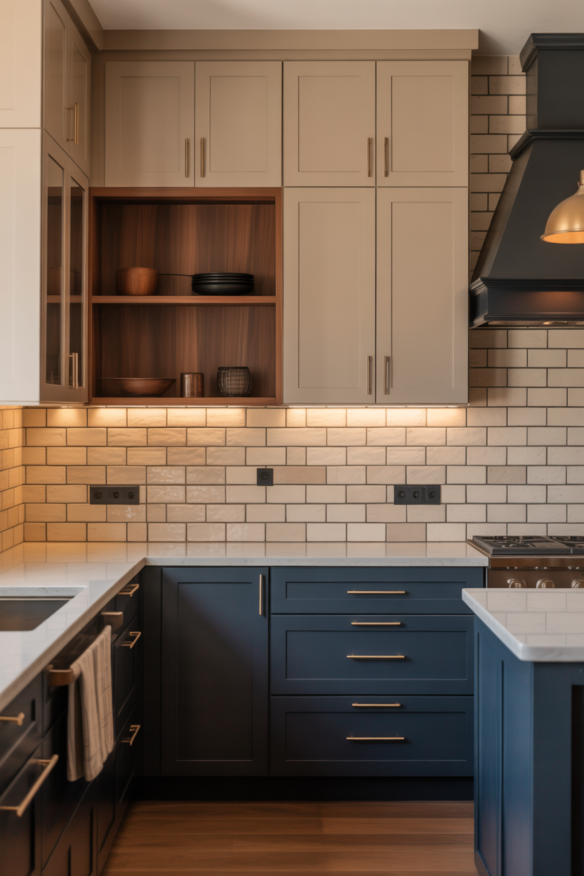While beige creates warmth, strategic contrast prevents the space from appearing bland. Dark lower cabinets with beige uppers create visual depth and grounding. Black or navy islands contrast beautifully against beige perimeter cabinets. Open shelving in darker wood tones breaks up expanses of beige cabinetry. Contrasting grout lines in tile backsplashes add definition and interest. These contrast elements ensure your beige kitchen feels dynamic rather than monotonous.