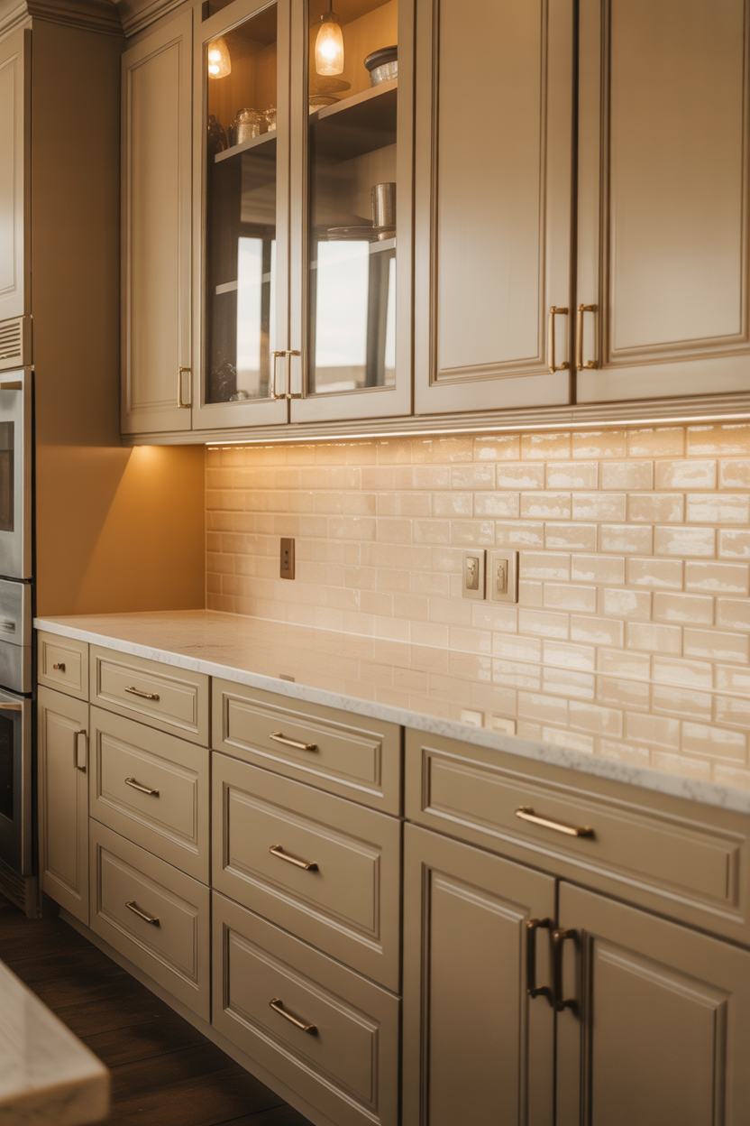 Backsplashes provide opportunities for creativity while protecting walls behind beige cabinets. White subway tile offers timeless appeal that never goes out of style. Natural stone in travertine or marble adds texture and luxury. Glass tile in neutral tones reflects light and adds dimension. Patterned cement tiles introduce bold design elements as focal points. Metallic tiles in copper or bronze enhance the warm aesthetic of beige cabinetry.