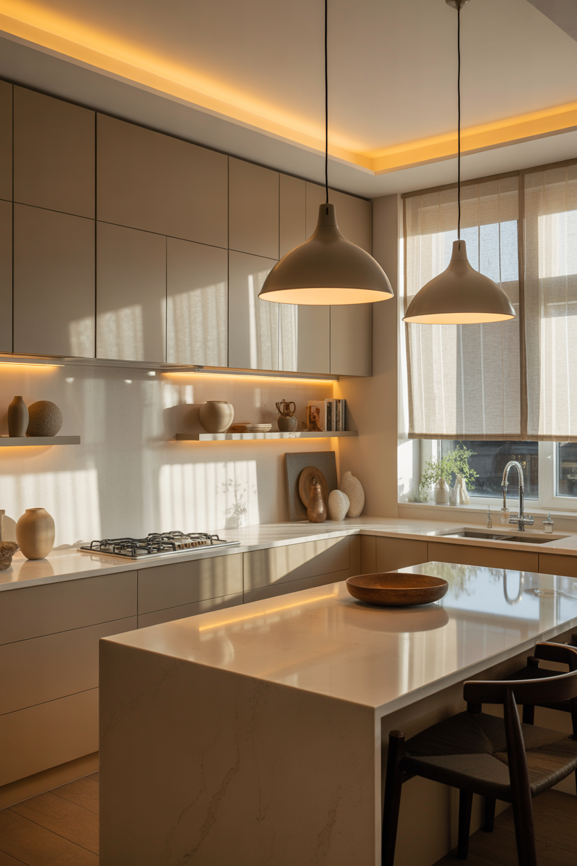 Proper lighting transforms beige and white kitchens from pleasant to spectacular. Layer your lighting with ambient overhead fixtures, task lighting under cabinets, and accent lighting in display areas. Warm-toned LED bulbs enhance the coziness of beige tones while maintaining the crispness of white countertops. Pendant lights over islands create focal points and add personality. Natural light should be maximized through window treatments that filter rather than block sunshine. Strategic lighting ensures your kitchen feels welcoming at all hours.