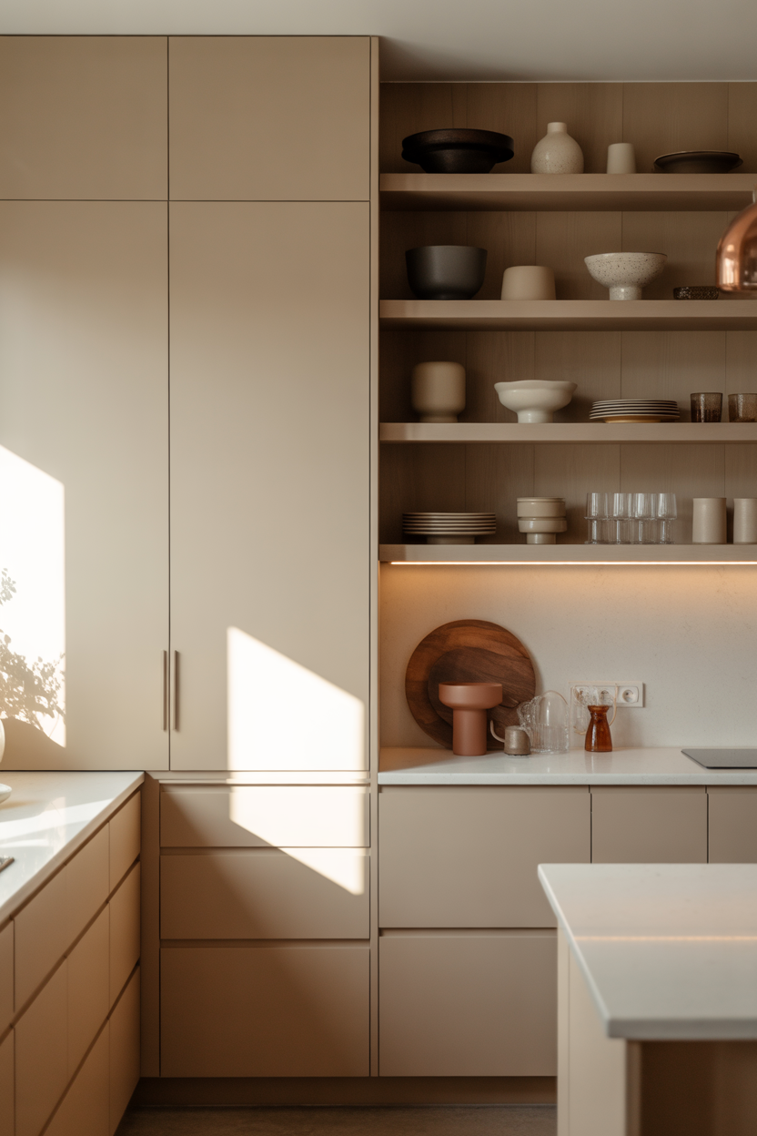 Deciding between open shelving and closed cabinetry affects your kitchen’s functionality and aesthetic. Open shelving breaks up beige cabinet expanses, creating visual breathing room. It showcases beautiful dishware and adds personality but requires regular tidying. Closed cabinets offer concealed storage, maintaining the clean lines that complement white countertops. A combination approach often works best—strategic open shelving for display with ample closed storage for everyday items. This balance respects the Beige Kitchen Cabinet Color while adding dimensional interest.