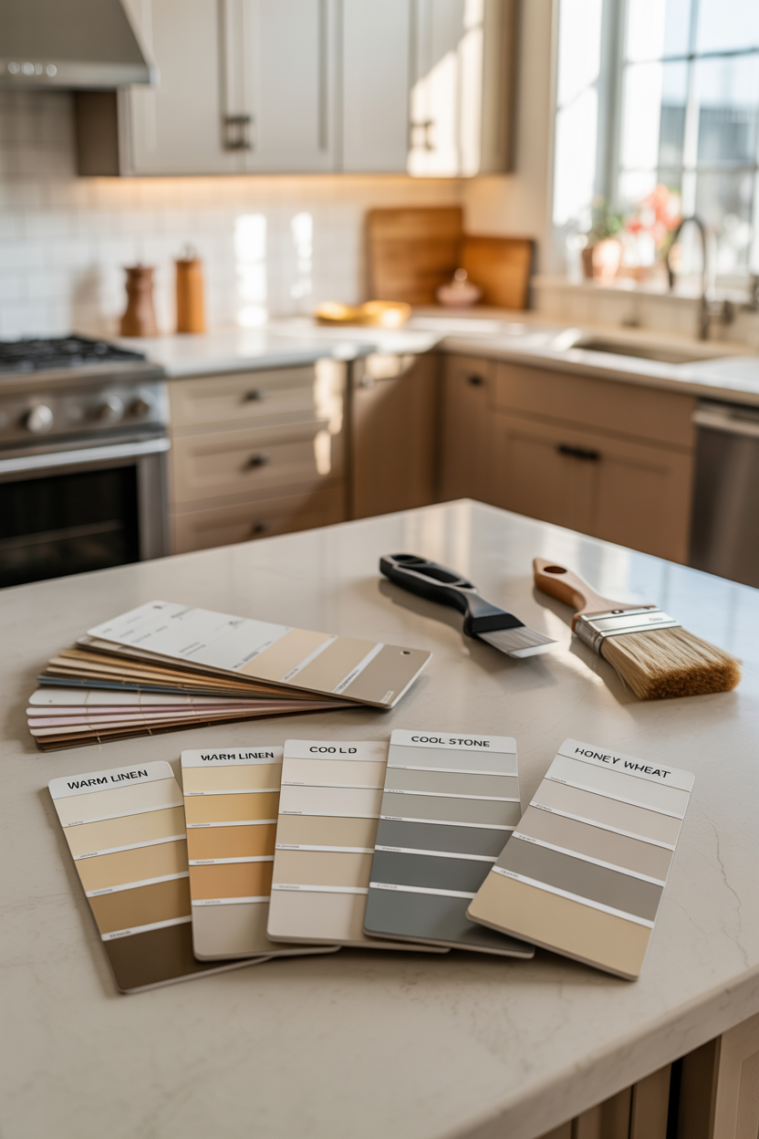 Wall colors significantly impact how your beige cabinets and white countertops are perceived. Soft whites create a cohesive, light-filled environment. Warm grays add sophistication and depth. Gentle blues or greens introduce color while maintaining tranquility. Warmer tones like soft terracotta or peachy beiges enhance the cozy factor. Consider your kitchen’s natural light exposure when selecting wall colors. North-facing kitchens benefit from warmer walls, while south-facing spaces can handle cooler tones beautifully alongside your neutral cabinetry.
