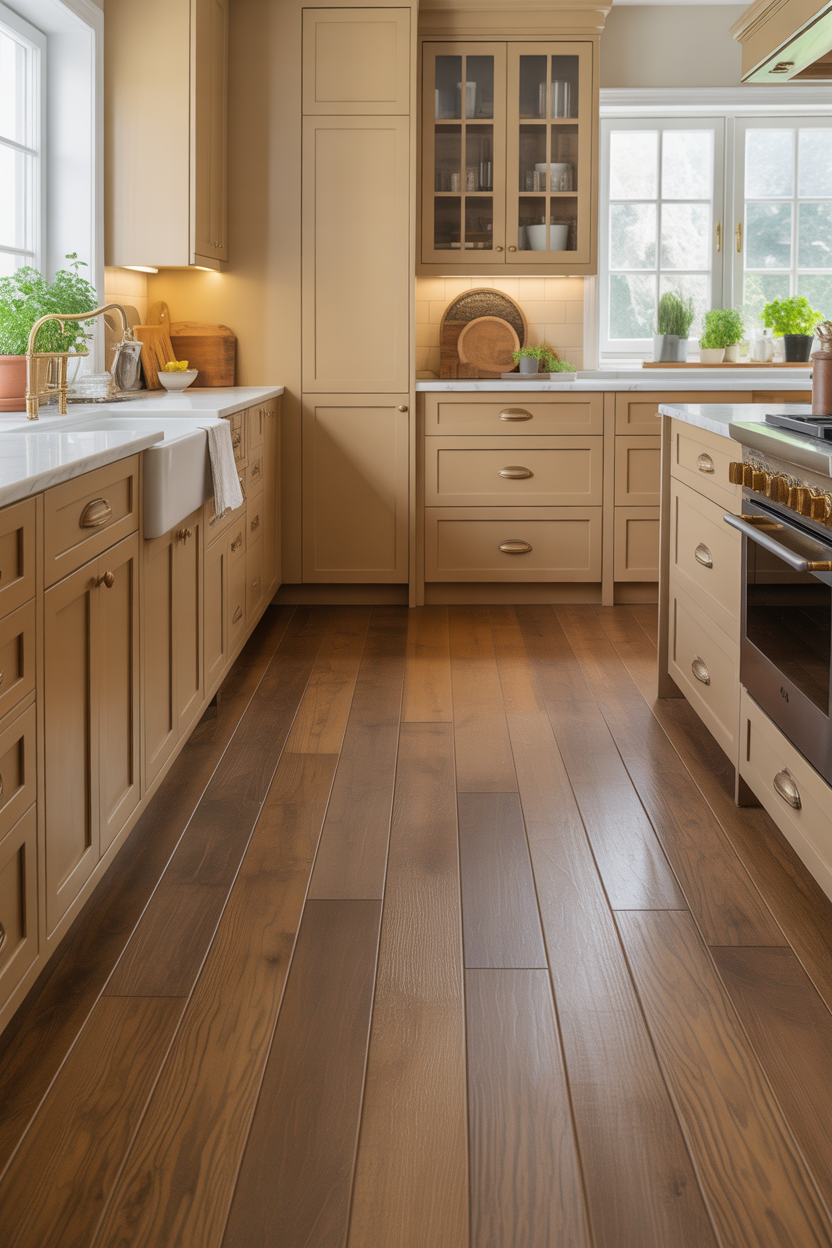 Consider the undertones in your beige cabinets when selecting flooring. Warm beige with yellow undertones pairs best with honey-toned woods, while cooler grays in your beige work well with whitewashed or gray-stained floors. The grain pattern also matters – wide planks create a modern farmhouse feel, while narrow strips suit traditional designs.