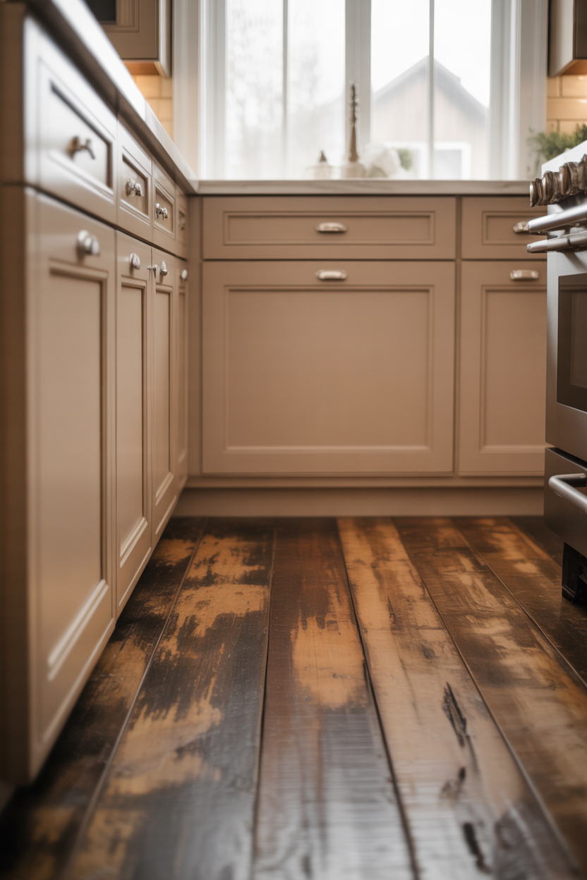 The beige kitchen cabinets provide a clean, updated element that prevents the distressed floors from appearing too rustic. Balance is key – the cabinets’ refinement elevates the rustic flooring, creating a curated look rather than an overly shabby appearance.