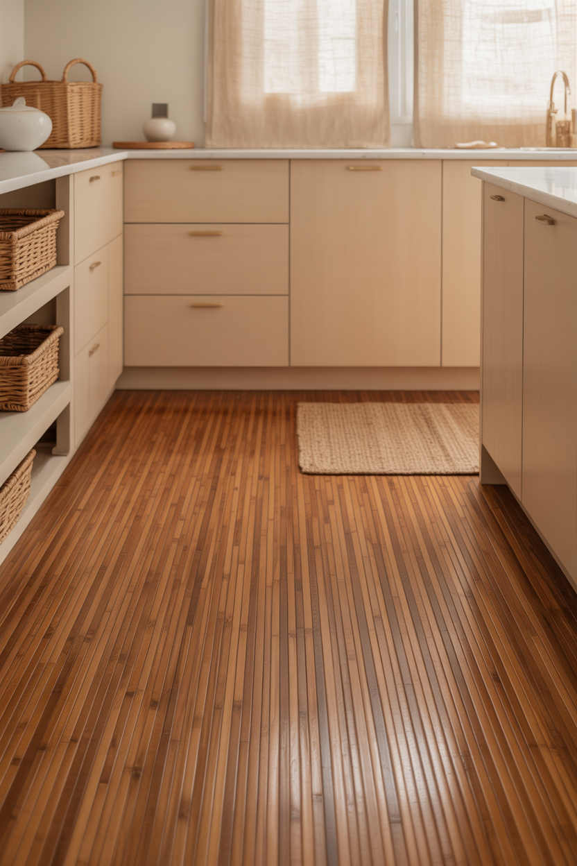 Sandy beige cabinets combined with natural bamboo flooring create an eco-friendly, coastal-inspired kitchen. The similar warm tones create a seamless flow that makes your space feel larger and more cohesive. Bamboo’s sustainable nature aligns perfectly with environmentally conscious design choices.