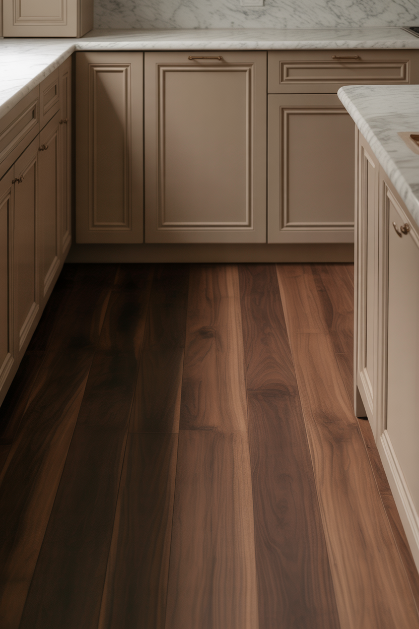 Dark walnut floors ground the space, making it feel anchored and substantial. This combination suits traditional, transitional, and even contemporary kitchens when styled appropriately. Use marble or quartz countertops in creamy whites or soft grays to lighten the overall palette while maintaining elegance.
