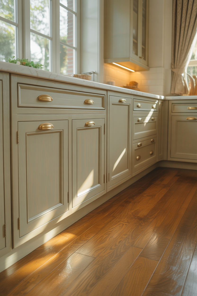 Light beige cabinets paired with warm wooden floors create an inviting, cottage-style atmosphere. This combination works exceptionally well in kitchens with abundant natural light, as the pale cabinets reflect sunshine throughout the space. The beige kitchen cabinets provide a soft backdrop that allows your wood flooring to become a beautiful focal point.