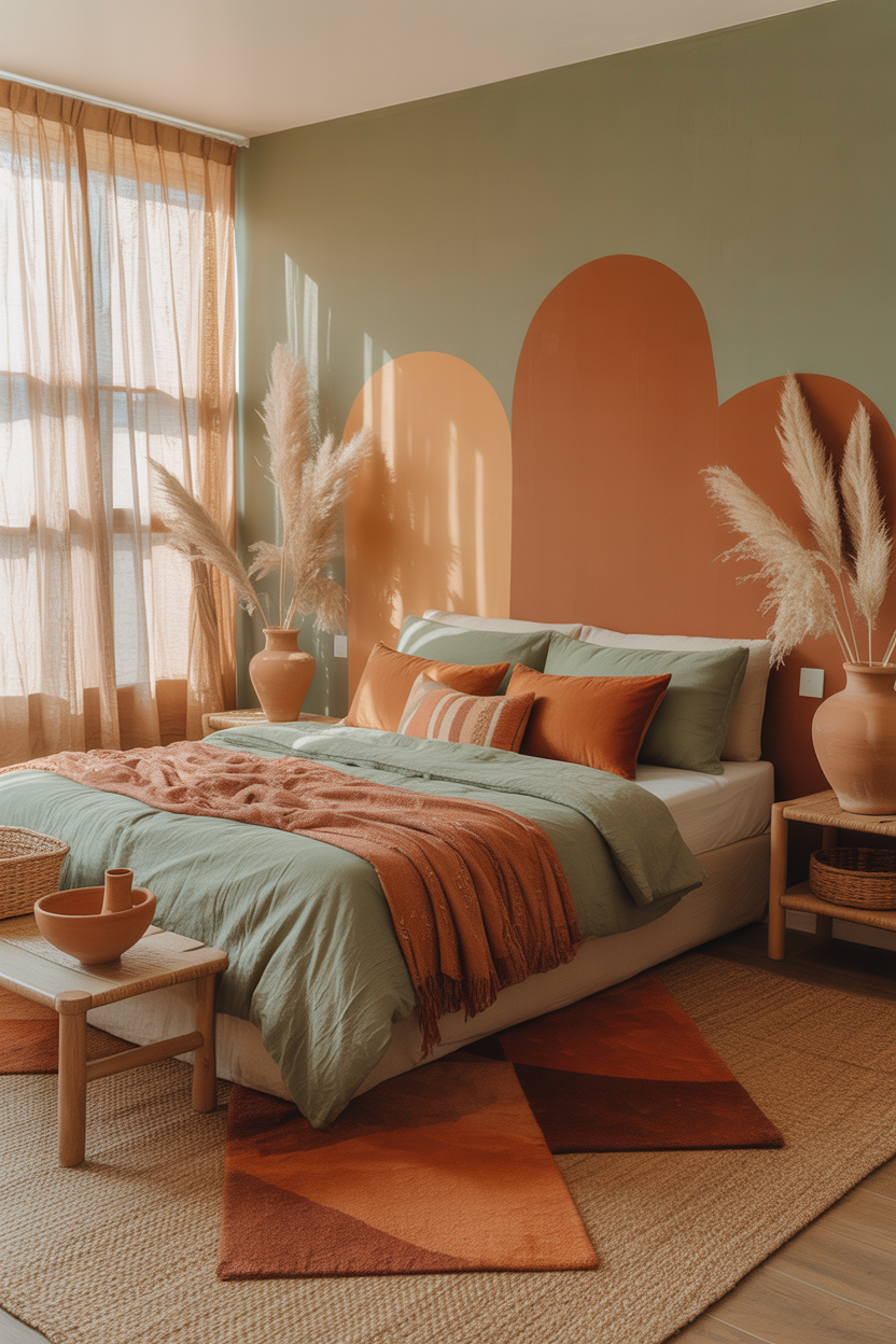 For a warmer, more bohemian approach to sage green bedroom ideas, combine sage green with terracotta accents. This earthy pairing creates depth and visual interest while maintaining a natural, grounded feel. Incorporate terracotta through decorative pillows, pottery, artwork, or even a statement rug. The warm, rust-colored tones of terracotta beautifully complement the cool undertones of sage green, creating a balanced and inviting atmosphere. This combination works particularly well in bedrooms with abundant natural light, where both colors can truly shine and create a warm, welcoming environment throughout the day.