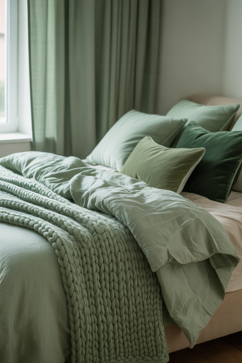 If you’re not ready to commit to painted walls, incorporating sage green through bedding and textiles offers a flexible alternative. A Sage Green Bedroom can be achieved simply by selecting the right duvet covers, throw pillows, and blankets. Layer different shades and textures of sage green textiles for depth and visual interest. Mix linen, cotton, and velvet fabrics in complementary green tones to create a luxurious, inviting bed. This approach allows you to easily update your bedroom’s look seasonally or as your preferences change without major investment.