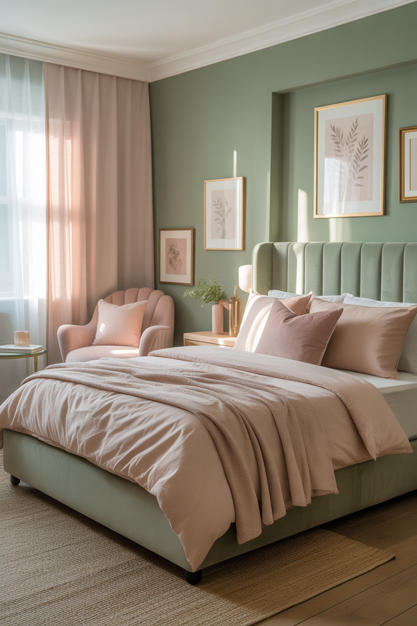Create a soft, romantic bedroom by pairing sage green with blush pink accents. This gentle color combination offers a modern take on traditional bedroom design, perfect for creating a Sage Green Bedroom with feminine charm. Use blush pink in throw pillows, artwork, or a cozy accent chair alongside sage green walls or bedding. The warm undertones of blush pink soften the coolness of sage green, creating a balanced and soothing palette. This pairing works beautifully in both contemporary and vintage-inspired bedroom designs.