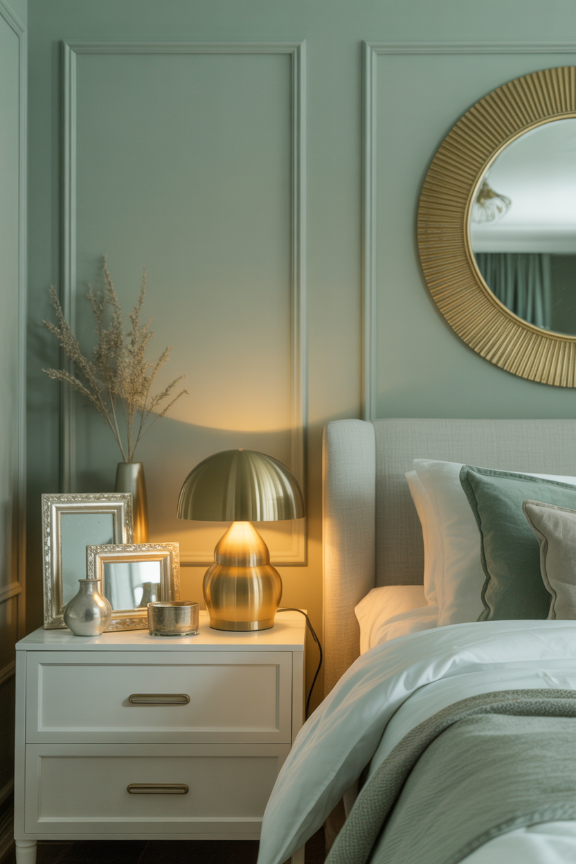 Elevate your sage green bedroom with carefully chosen metallic accents. Gold and brass fixtures add warmth and luxury, creating a sophisticated contrast against the cool tones of sage green. Silver and chrome offer a more modern, sleek aesthetic when paired with this versatile hue. Incorporate metallics through light fixtures, drawer pulls, mirror frames, or decorative accessories in your sage green bedroom ideas. The reflective quality of metals adds dimension and light to the space, preventing the room from feeling flat or one-dimensional.