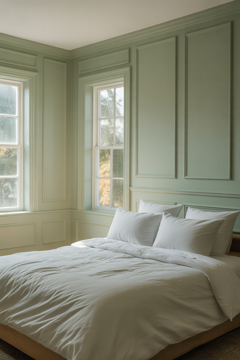 Light sage green wall paint serves as the foundation for your Sage Green Bedroom transformation. This soft, muted tone reflects natural light beautifully, making small rooms appear larger and more airy. Unlike darker shades that can make compact spaces feel cramped, light sage green opens up the room while maintaining a cozy atmosphere.