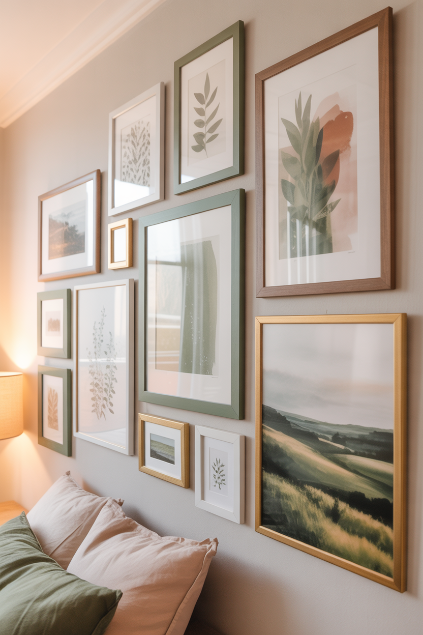 Gallery walls with multiple smaller frames create visual impact without requiring large wall expanses. Mix sage green artwork with black-and-white photographs or gold-framed pieces for an eclectic, collected-over-time appearance that adds depth and character to small spaces.