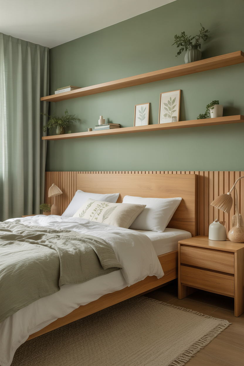 Floating shelves in sage green provide essential storage while serving as decorative elements. These wall-mounted solutions keep floor space clear, crucial for small bedroom functionality. Use them to display books, plants, or decorative objects that complement your color scheme.
