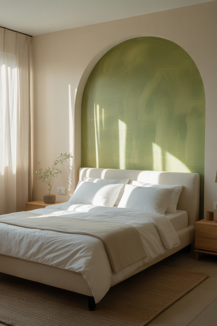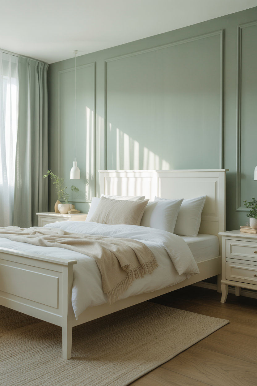 Pair your sage green accent wall with crisp white or soft cream on the remaining walls to maximize brightness. This contrast enhances the room’s dimensions while maintaining the soothing ambiance. You can also experiment with textured finishes like limewash or matte paint to add visual interest without cluttering the space.