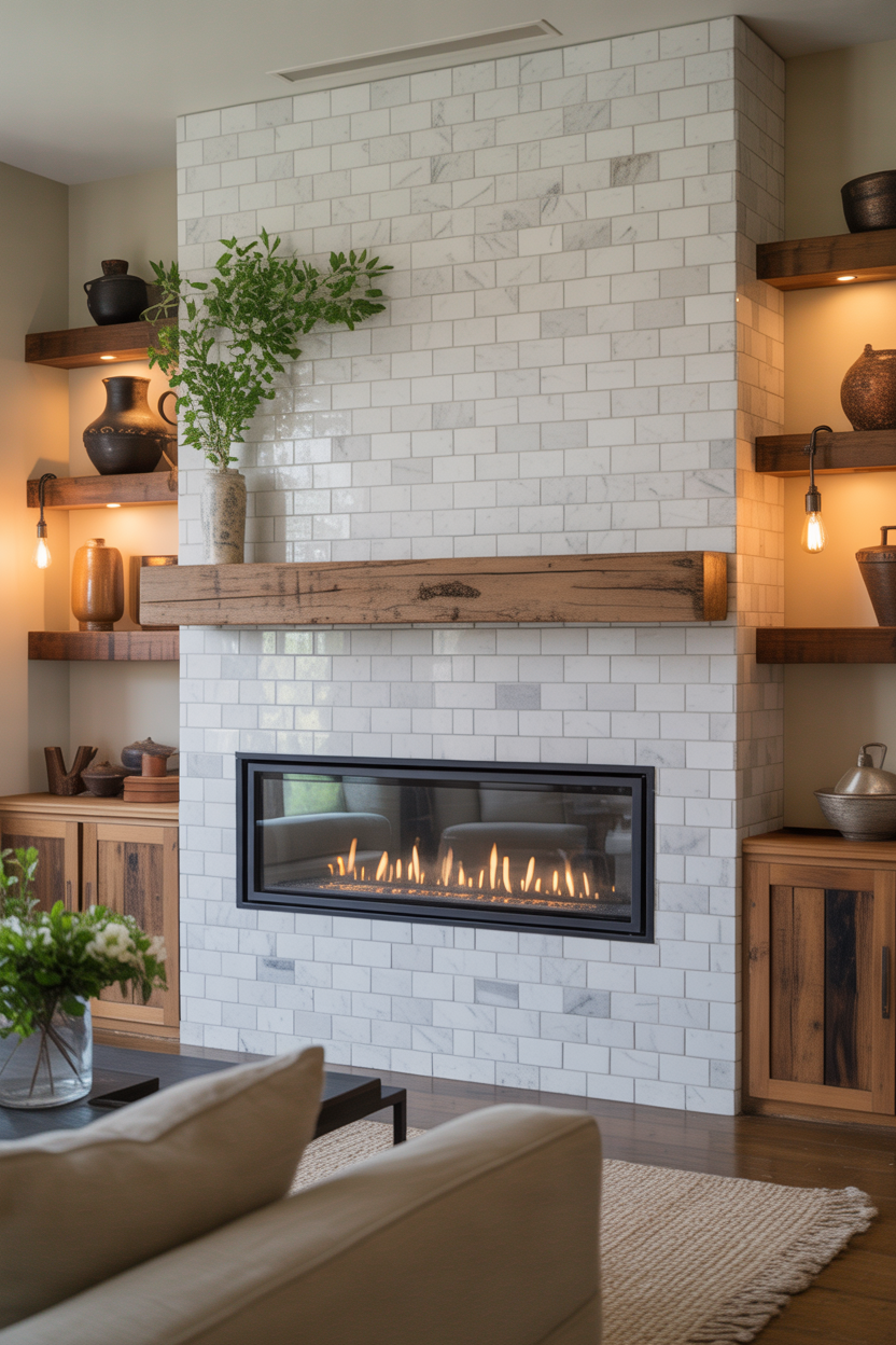 Contemporary farmhouse fireplace ideas merge current design trends with rustic charm. Linear gas fireplaces with floor-to-ceiling tile surrounds create stunning vertical elements that draw the eye upward.
