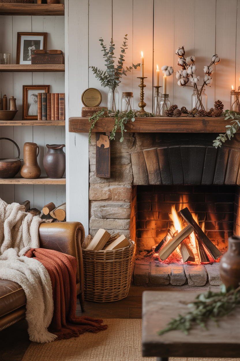 Enhance your Cozy Farmhouse Fireplace with carefully curated warm decor elements that amplify the inviting atmosphere. Layer textures through woven baskets, plush throw blankets, and vintage accessories displayed on the mantel.