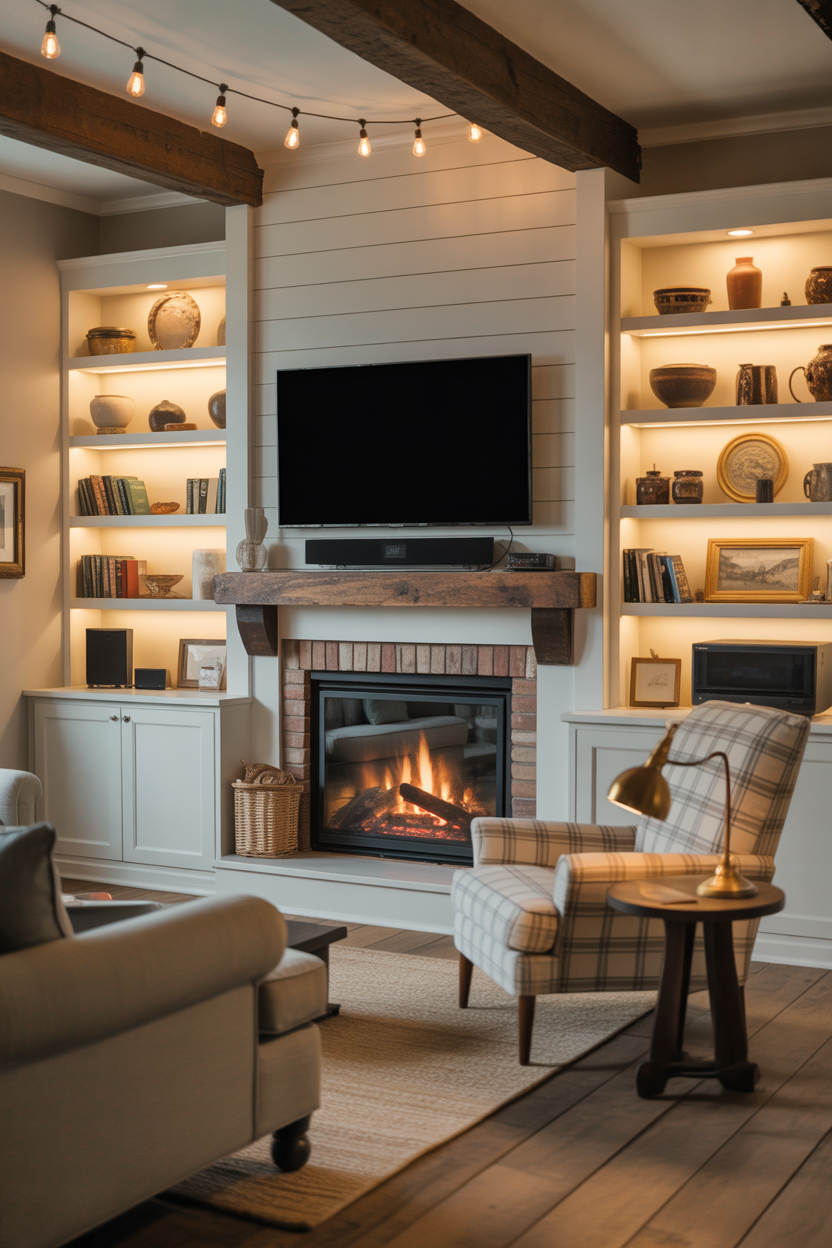 Design the surrounding cabinetry to hide media components while displaying decorative items. Create distinct zones around the fireplace for different activities—reading nook on one side, entertainment center on the other. Include adequate electrical planning for lamps, chargers, and seasonal lighting. These functional farmhouse fireplace ideas ensure your space works hard while looking beautiful, adapting to your family’s evolving needs throughout the seasons.