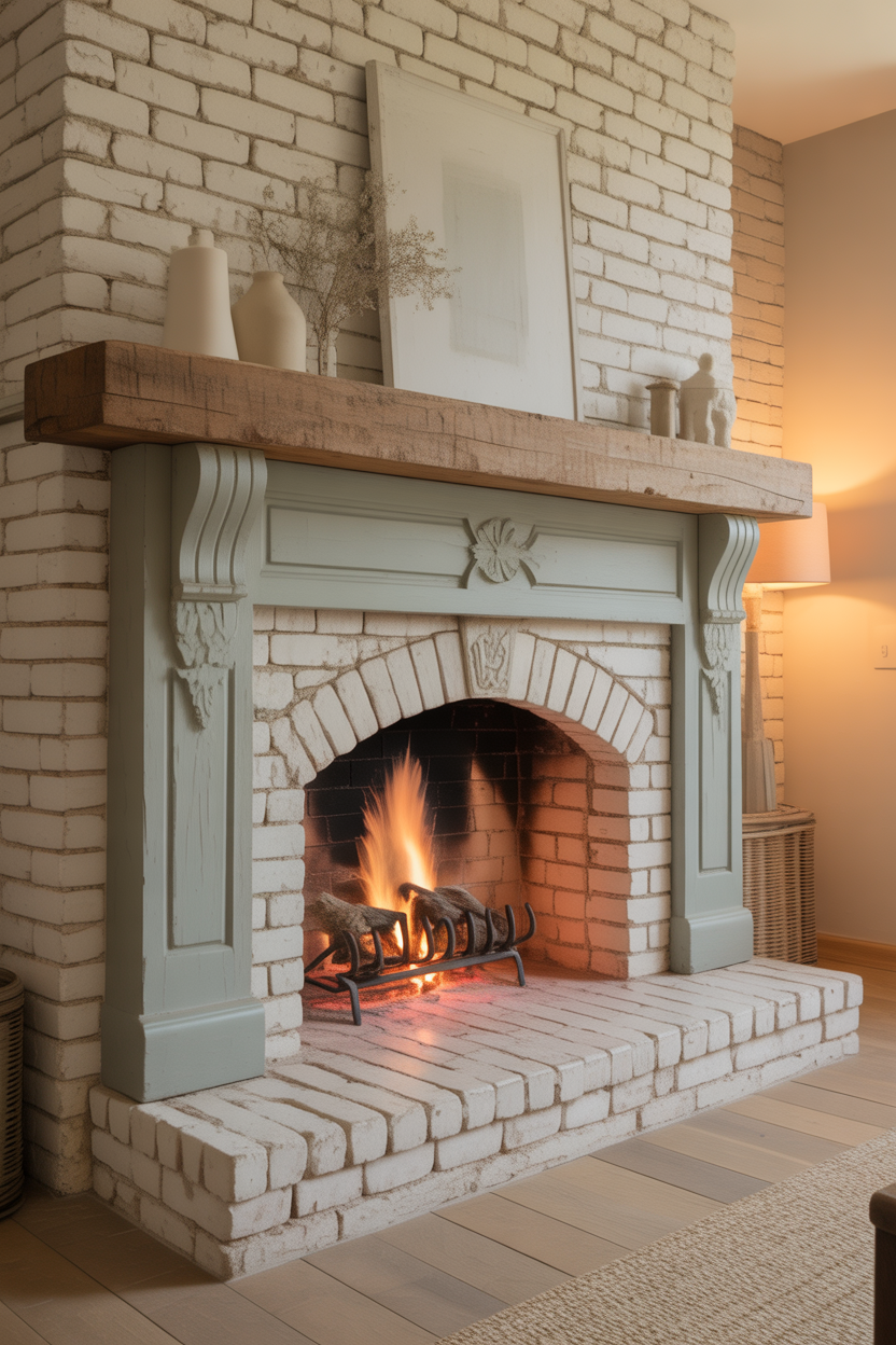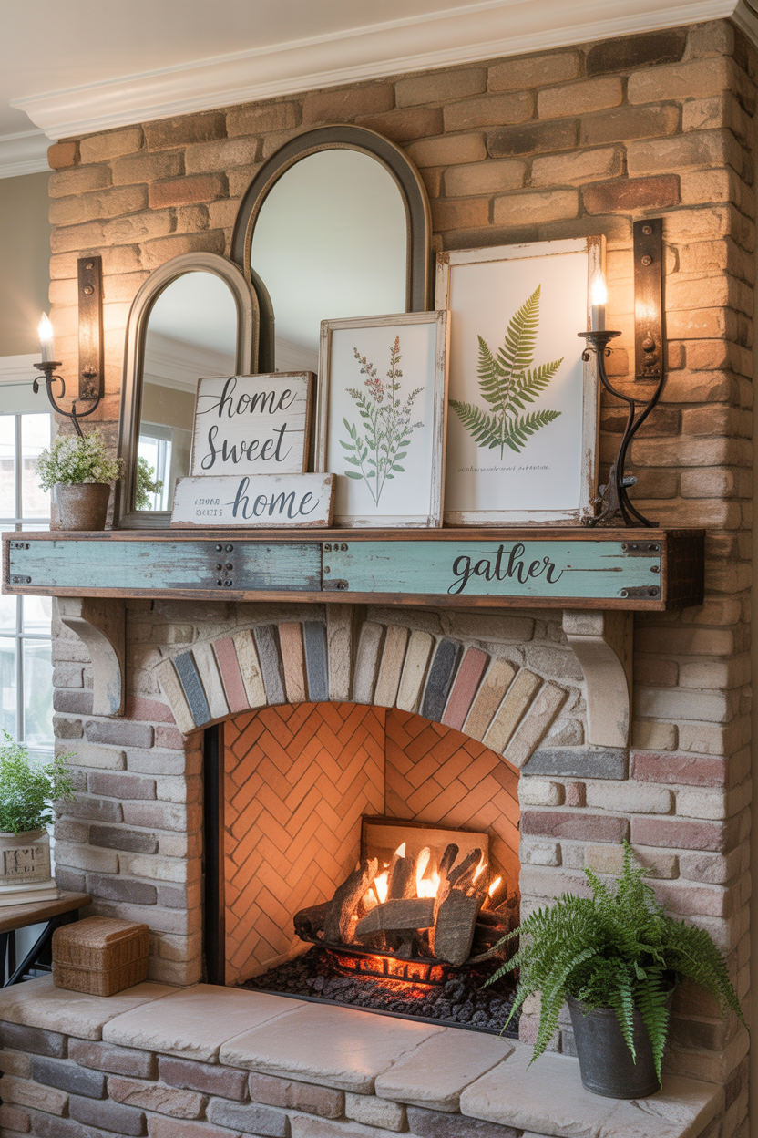 Consider asymmetrical mantel displays featuring oversized mirrors, vintage signs, or botanical prints in distressed frames. These farmhouse fireplace ideas prove that style and coziness aren’t mutually exclusive—they enhance each other beautifully.